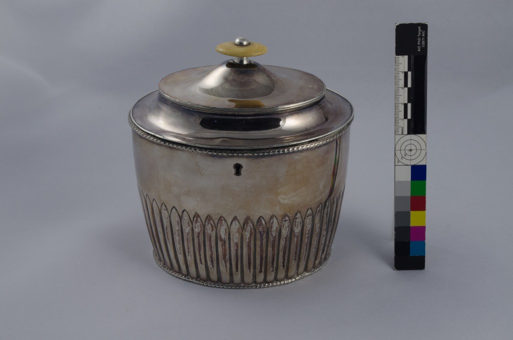 Eight Sheffield silver objects are part of Major General Anthony Wayne’s purchase, descended in the Wayne family from Anthony Wayne and his son, Isaac, to subsequent generations, that are on display at Historic Waynesborough. They were made in England by an early process of fusing a thin sheet of silver over copper. In the past, as the objects were used and routinely polished, areas of the thin silver layer were abraded; some led to a complete loss of silver and the copper was exposed. On exhibit at Waynesborough, it is desirable to present these objects with a polished silver surface, without tarnish. However, left in the open, silver tarnishes, and even very gentle polishing removes some silver, so to best preserve the objects, there should be minimal polishing.